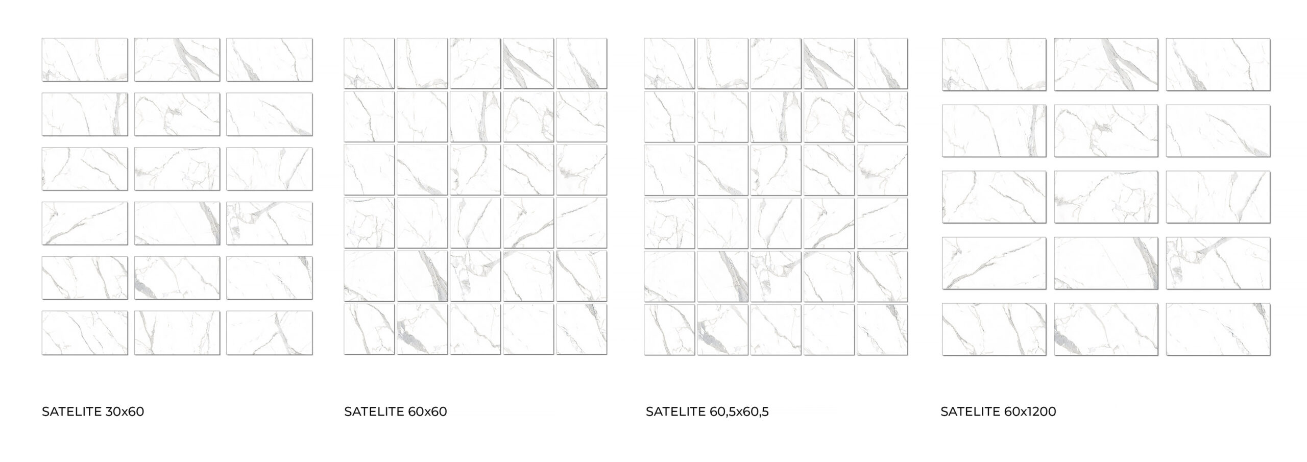 3. Format: 300x600x8 mm (SATTELLITE MATT 30×60), 600x600x9,6 mm (SATTELLITE BRILLO 60×60), 600x600x9,1 mm (SATTELLITE BRILLO 60,5×60,5), 600x1200x9,7 mm (SATTELLITE BRILLO 60×120), 600x600x9,10 mm (SATELLITE MATT 60×60), 600x1200x9,3 mm (SATELLITE MATT 30×60)