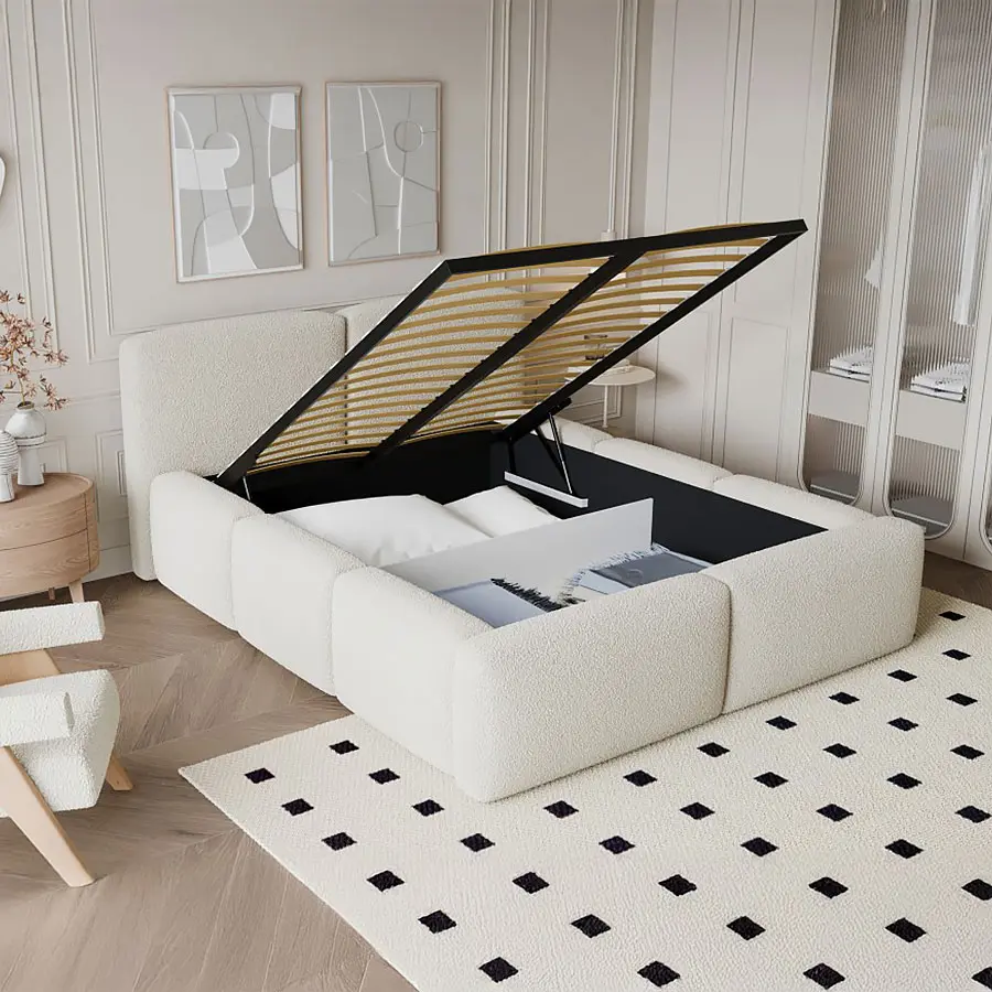 Interesse. Großer Bettkasten mit Gasdruckfedern für leichtes Öffnen; Stahlrahmen mit federnden Leisten für Stabilität.