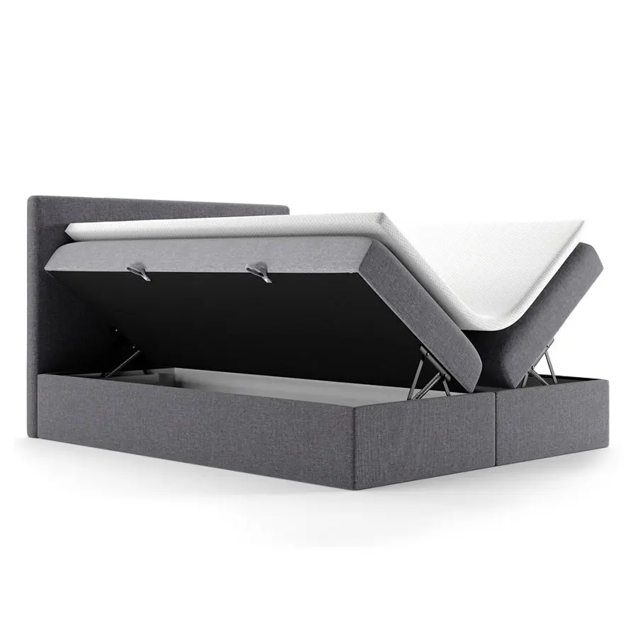 Praktische seitliche Bettkästen mit Federautomatik schaffen wertvollen Stauraum für Bettwäsche, Decken oder Textilien – eine besonders funktionale Lösung für kleinere oder multifunktionale Räume. Die Konstruktion aus Massivholzrahmen, MDF und Polyurethanschaum gewährleistet Stabilität und Langlebigkeit.
